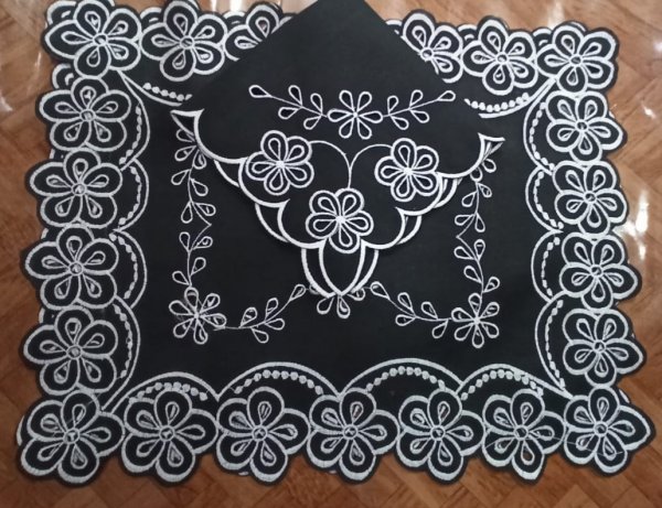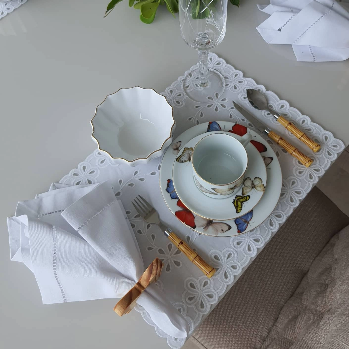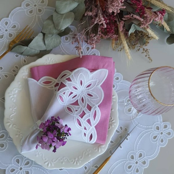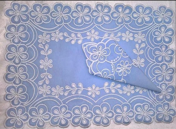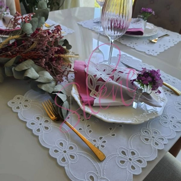 Kit acompanha: 6 Americanos retangulares em Richelieu 6 Guardanapos em Richelieu